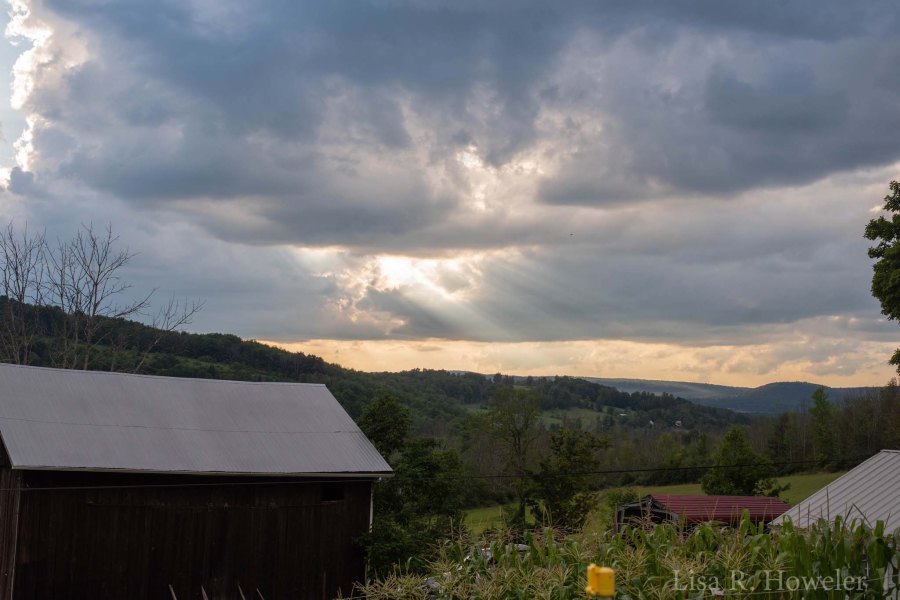 I visited my Dad’s garden this week to grab some kale (he has tons and now I have tons waiting to be cooked) and not only took some photos of the garden, but the sun pouring through the clouds overlooking the property and some of the purple cone flowers at the front of the house.