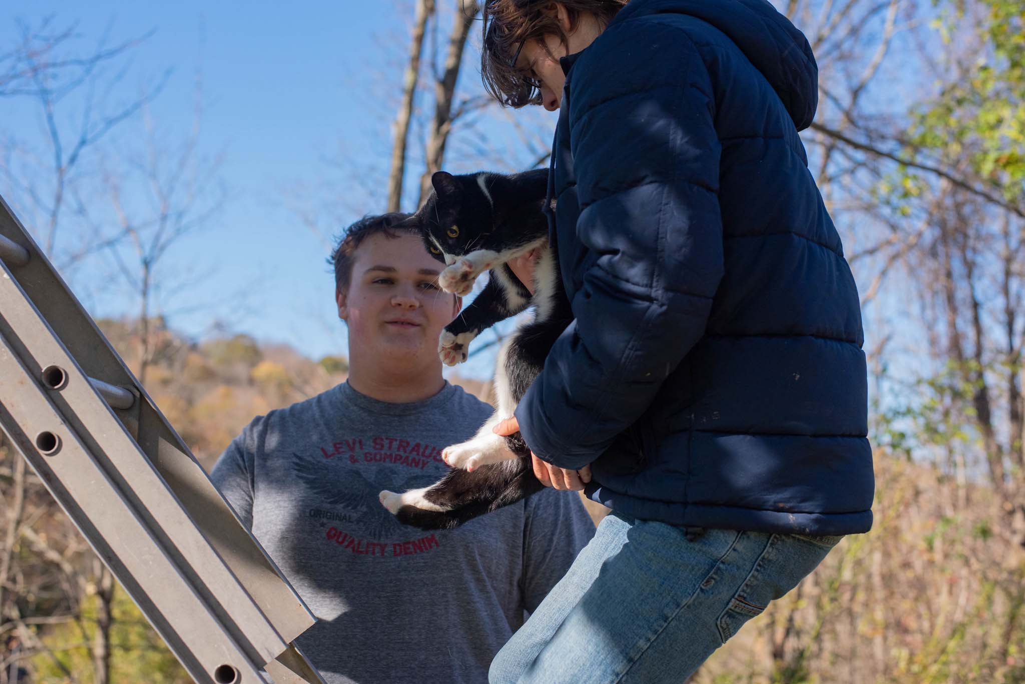 These men had other jobs they were taking their time away from. I tried to tell them to just leave her up there. I don’t think they wanted a small cat to defeat them, though. My son and his friends and my daughter were watching, as well, and I don’t think they wanted to disappoint them.