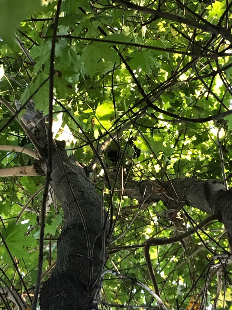 The borough man (I’m not giving his real name because I don’t have his permission) told me he’d swing by a couple of times during the day to see if she’d come done. I thanked him and headed back upstairs because I had slept wrong, bending my neck oddly, and had a horrific headache. Later in the morning, I went down to the tree and sat, eating some cereal, and talking to Scout, hoping it would coax her down. She came down a couple of limbs but panicked and scampered up again.