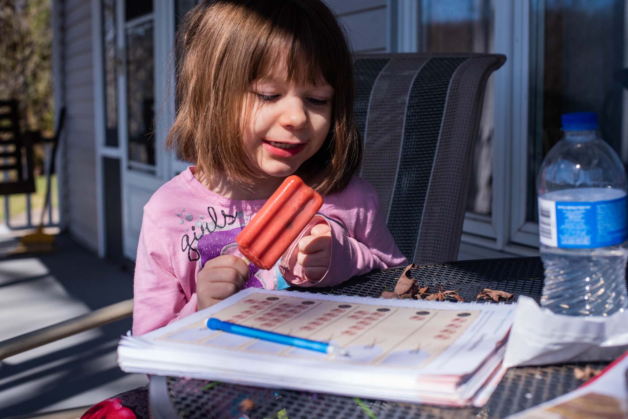 On Tuesday, Little Miss and I spent most of the afternoon and evening outside. She made her nature salad (which consists of her gathering grass, leaves, flowers, and other natural substances to make a type of salad we pretend to eat), the animals explored outside, and then we did our schoolwork outside as well.