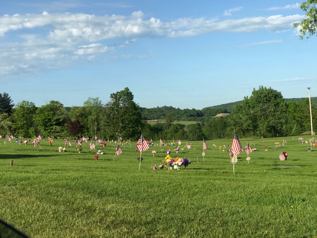Stuffing our emotions back in, we headed back to the car and then drove around the other side of the cemetery to my aunt and uncle’s grave. This is my dad’s sister and her husband. Next to their grave, is the burial spot of a friend/neighbor of my dad’s and a cousin of my uncle’s — a decorated Vietnam War veteran who reminds my dad of the darker side of being a member of the United States Army. This man (first name Guy) was a sniper, was injured, earned a Purple Heart, and then was placed on duty to escort dead soldiers home from Vietnam. Guy killed himself in 1998 in the woods behind his house, a short drive from my parents’ house, we believe to stop the memories of all he’d seen.