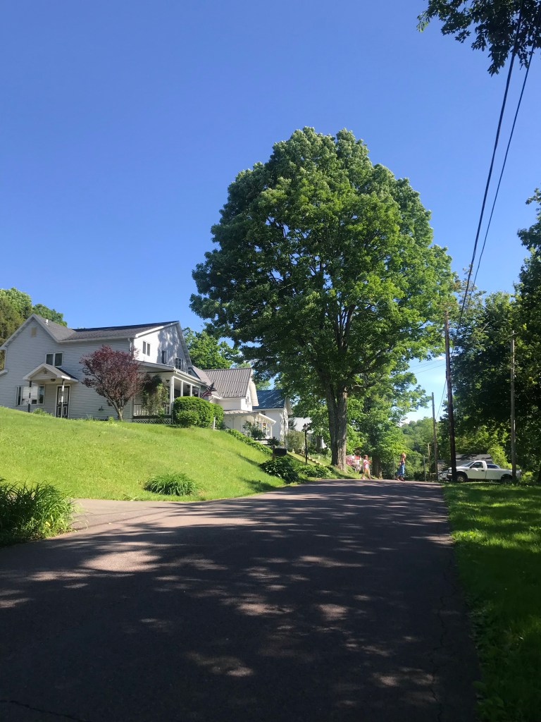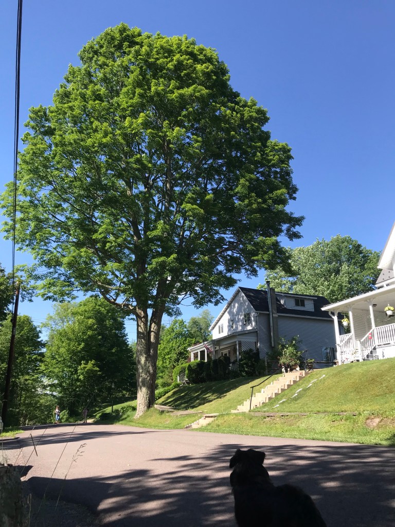 Still, I can’t blame the residents on this street of being concerned about these large trees in front of their houses. They are more hyperaware of what can happen in a windstorm than others might be, considering this town, particularly this street, in addition to a large part of the town below it, was actually struck by a rare Pennsylvania tornado four years ago (the year before we moved here). It shredded trees and left them a tangled mess all over the street, the bank, and the woods next to our other neighbors’ house, as well as yanking down powerlines and ripping the roof off the steeple of the town’s prominently displayed Catholic Church on the hill. This is the church that features the bells which sound each day at 6 a.m., 9 a.m., noon, 6 p.m., and 9 p.m.