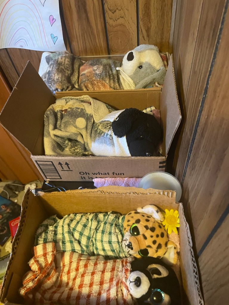 My daughter does the same thing with stuffed animals, though not always in boxes. It’s cute, especially when I find one unexpectedly, but also a little annoying when I’ve spent forever looking for something that she decided to use. It’s kind of an established fact that, if we can’t find something, to ask her where it is.