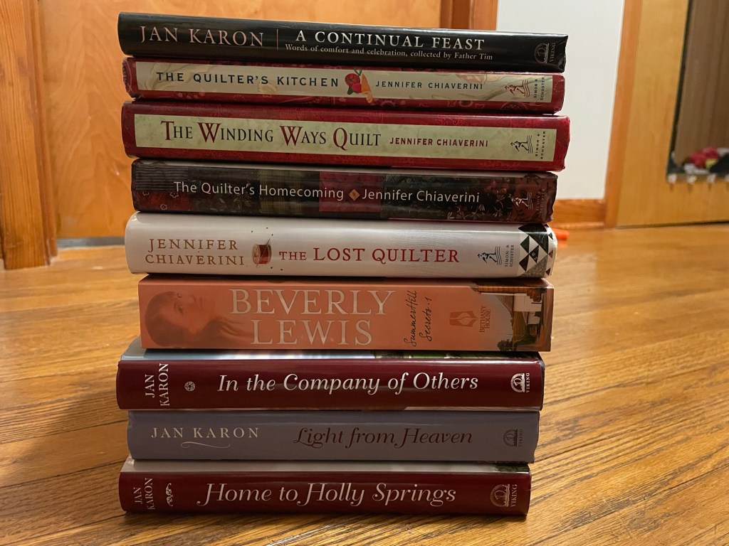 The books were four from the Mitford series by Jan Karon, four from the Elm Creek Quilter series by Jennifer Chiaverini, and a Beverly Lewis book. I’ve never read a lot of Beverly Lewis, but I have read all of the Mitford books and two of the Elm Creek Quilter books (though not any of these particular ones.)