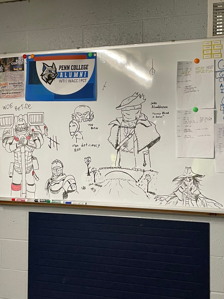 The Boy has also been getting back into art again. He drew these characters from various video games on the white board in his classroom at the technical school: