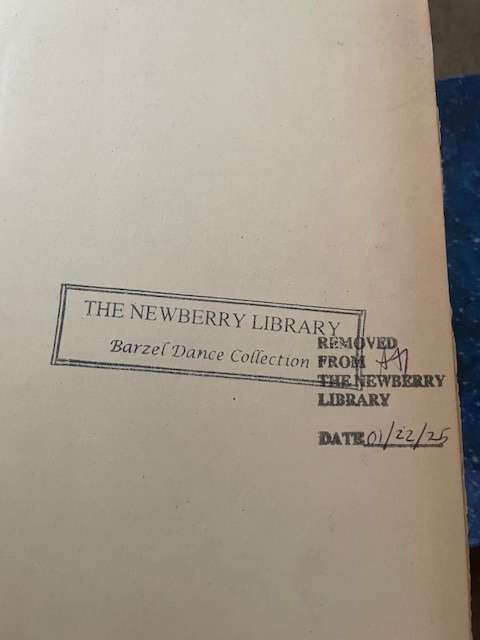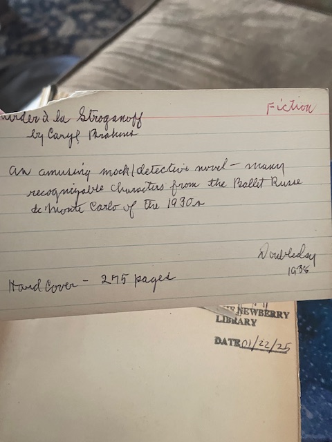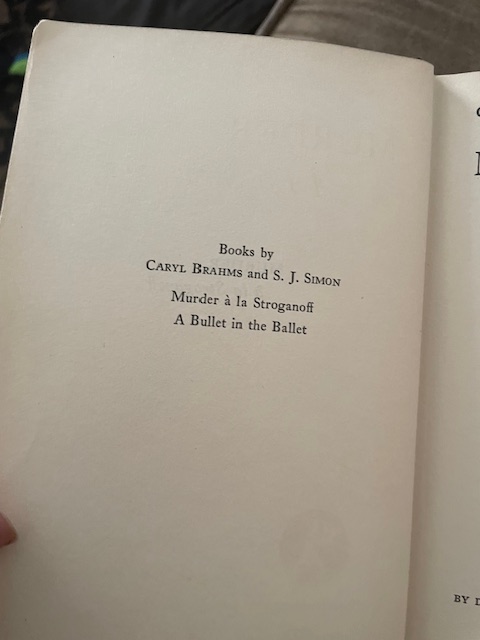 I had never heard of the book, but it was called Murder A La Stroganoff by Caryl Brahms and SJ Snow. Inside the cover, it had a stamp that said it was from the Newberry Library, had been retired from their shelves, and was part of the Barzel Dance Collection. I searched a little more online and these books are fairly rare because it is a first edition from 1938 and the book is no longer in print. They did issue a paperback copy in 1985, but there are not a ton of the hardcovers published by The Crime Club, Doubleday & Co, New York out there.