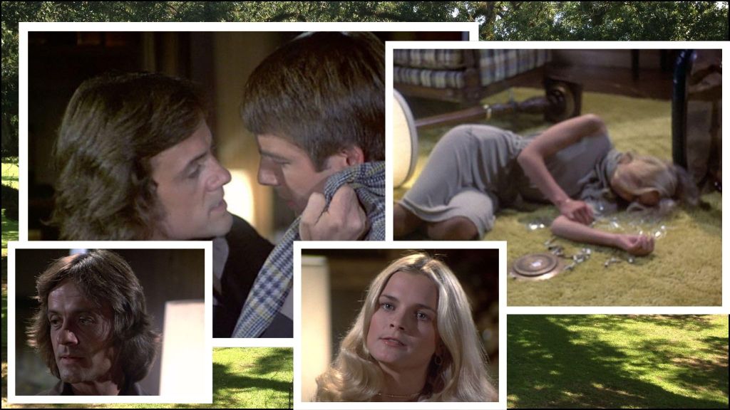 When George drops Nancy off, she realizes she forgot her purse. She goes back to the house where the party was, which we eventually figure out was the house of the manager. Before she gets there we viewers are shown the manager, Ben Halstead (Terry Kiser), standing with the blond girl, Paula, and they are looking down at an unconscious Chip. Paula asks Ben how much he gave him.