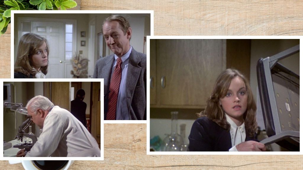 After Nancy argues with her dad we switch scenes to the lab where an older man with white hair is looking under a microscope right when a man dressed in all black clothes, including a mask, bursts in.