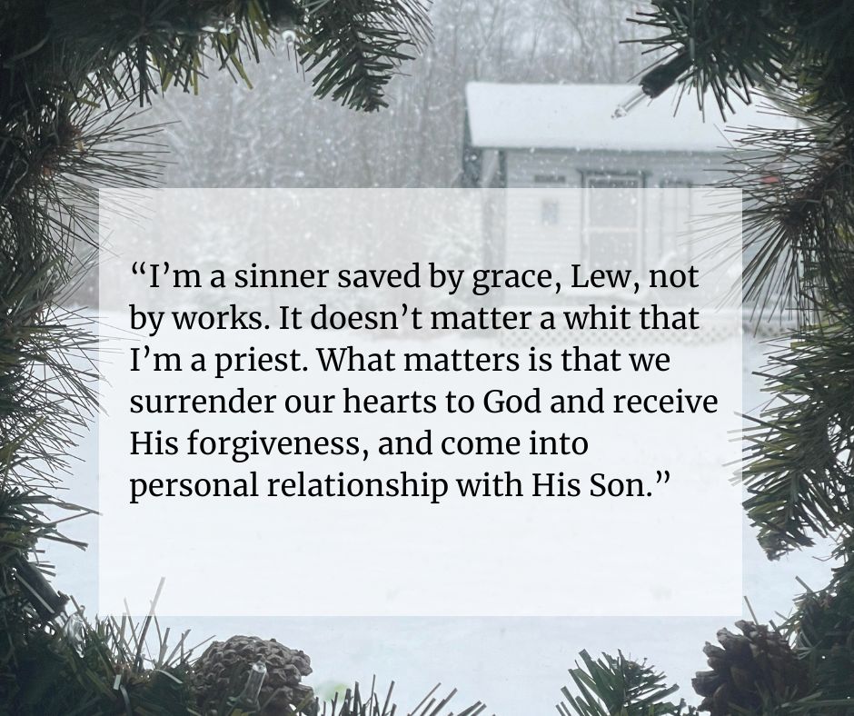 “I’m a sinner saved by grace, Lew, not by works. It doesn’t matter a whit that I’m a priest. What matters is that we surrender our hearts to God and receive His forgiveness, and come into personal relationship with His Son.”