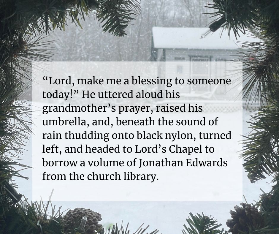 “Lord, make me a blessing to someone today!” He uttered aloud his grandmother’s prayer, raised his umbrella, and, beneath the sound of rain thudding onto black nylon, turned left, and headed to Lord’s Chapel to borrow a volume of Jonathan Edwards from the church library.