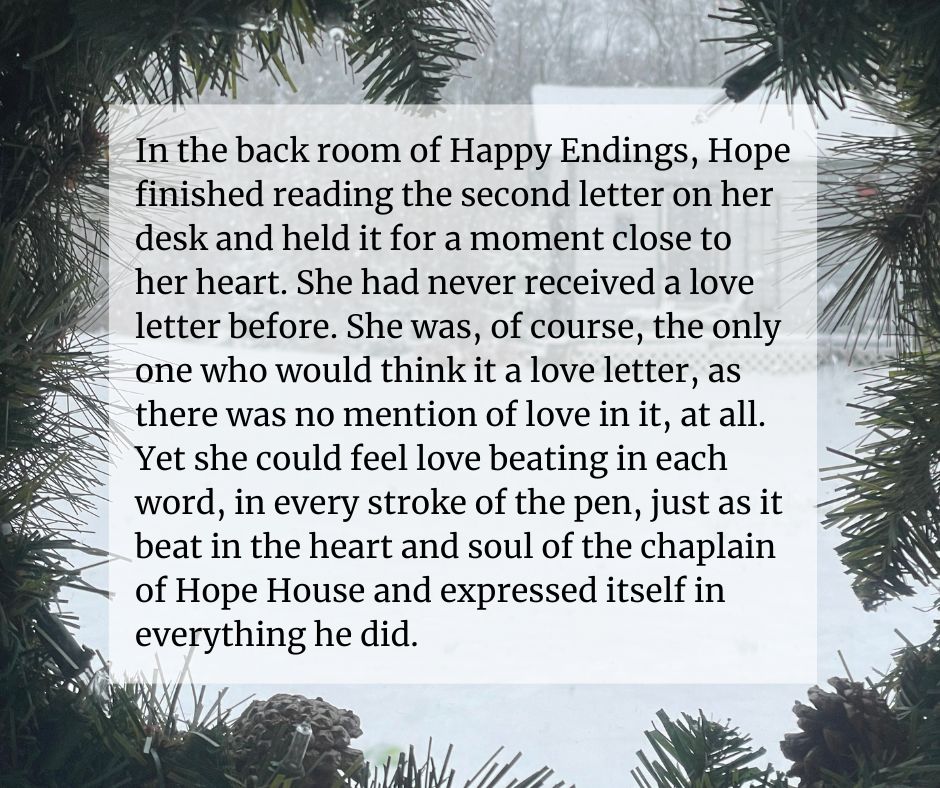 In the back room of Happy Endings, Hope finished reading the second letter on her desk and held it for a moment close to her heart. She had never received a love letter before. She was, of course, the only one who would think it a love letter, as there was no mention of love in it, at all. Yet she could feel love beating in each word, in every stroke of the pen, just as it beat in the heart and soul of the chaplain of Hope House and expressed itself in everything he did.