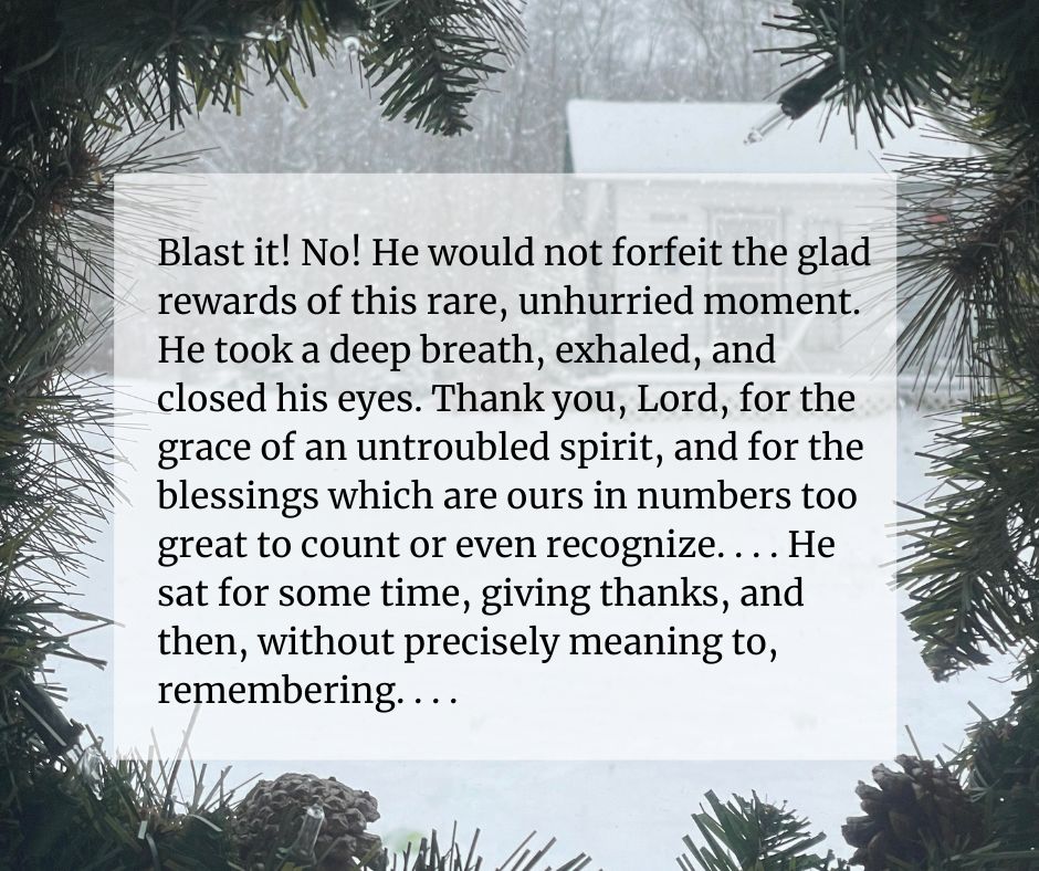 Blast it! No! He would not forfeit the glad rewards of this rare, unhurried moment. He took a deep breath, exhaled, and closed his eyes. Thank you, Lord, for the grace of an untroubled spirit, and for the blessings which are ours in numbers too great to count or even recognize. . . . He sat for some time, giving thanks, and then, without precisely meaning to, remembering. . . .