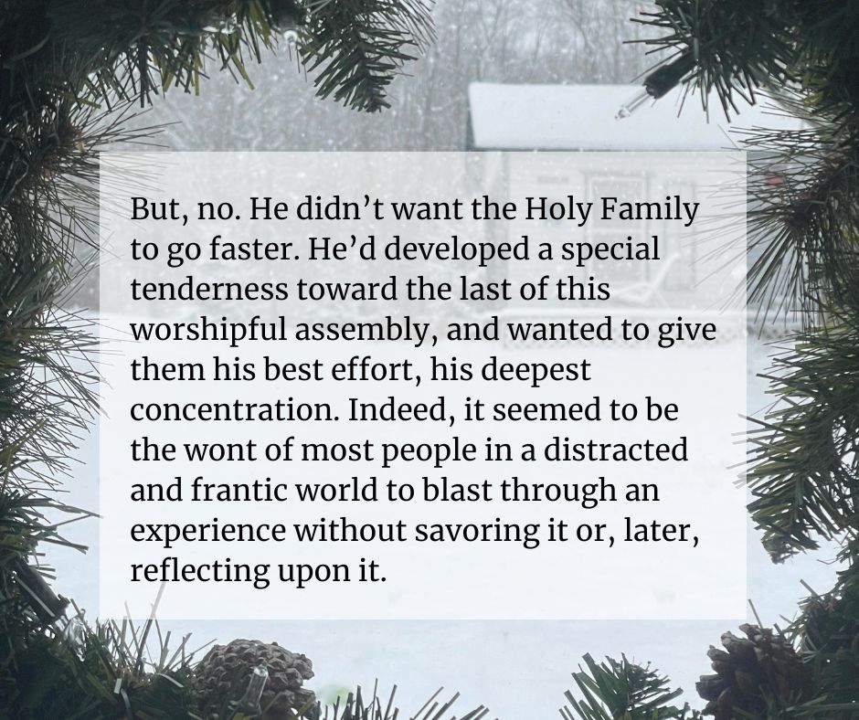 But, no. He didn’t want the Holy Family to go faster. He’d developed a special tenderness toward the last of this worshipful assembly, and wanted to give them his best effort, his deepest concentration. Indeed, it seemed to be the wont of most people in a distracted and frantic world to blast through an experience without savoring it or, later, reflecting upon it.