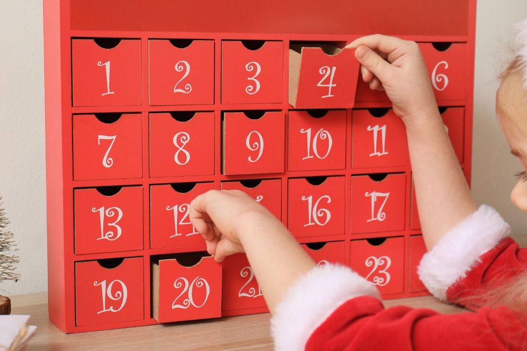 An advent calendar is some way to countdown to Christmas. It is either a picture or object featuring windows where one window or door is opened each day leading up to Christmas. The phrase advent calendar comes from the German word Adventskalender.