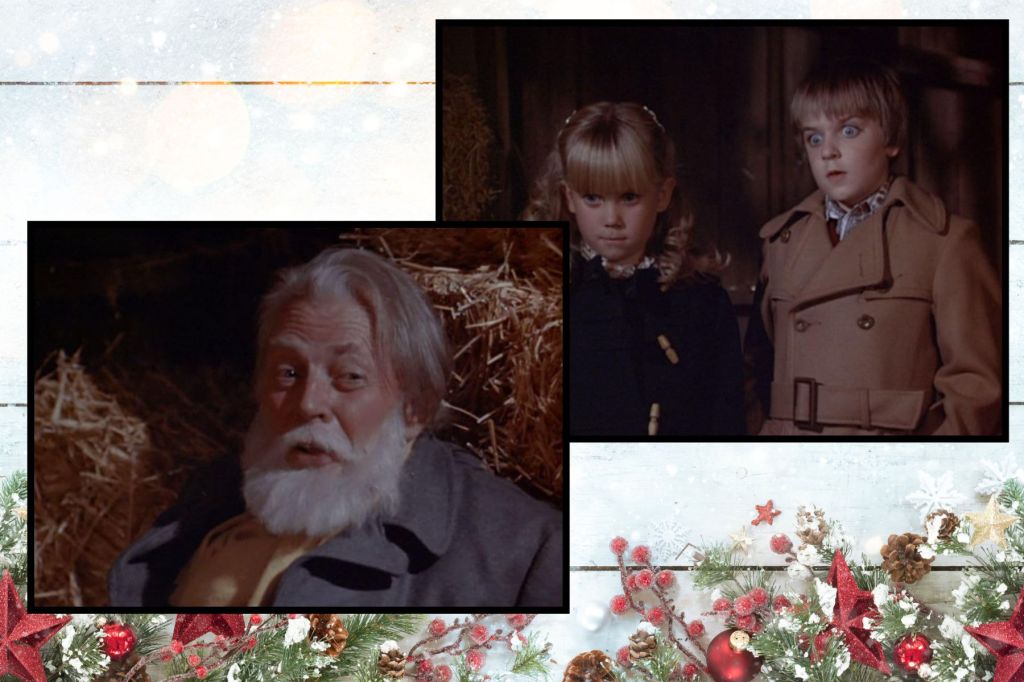 He staggers to the barn, unspotted by the Santa who is still busy climbing down, goes inside and lays down in the straw to take a nap. He isn’t there long, though, before two rich kids are looking down at him and saying “Daddy doesn’t allow anyone in the barn.”