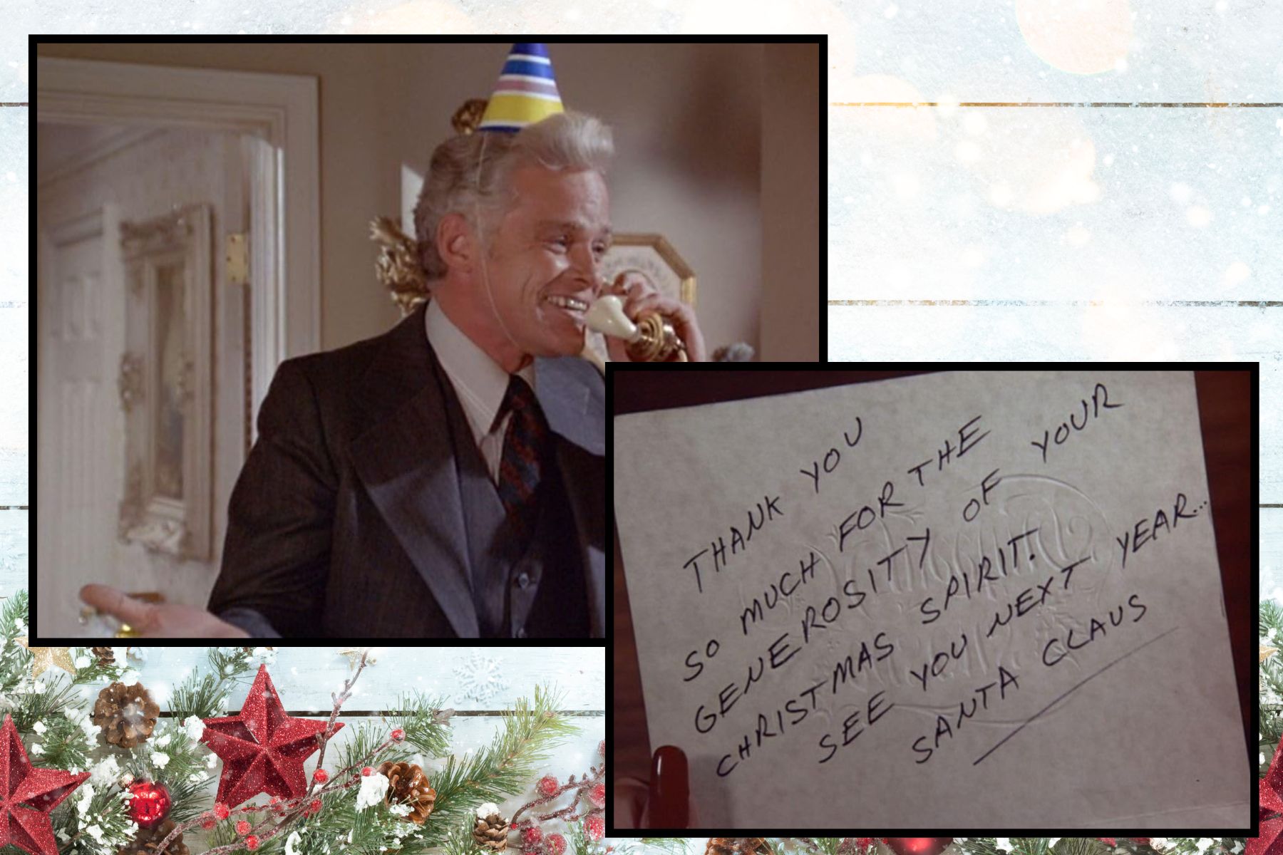 Scene shift. Now there is a man dressed as Santa breaking into a house and stealing things while in the other room a white-haired man is on the phone asking Carson Drew, “Hey, cousin, where are you? The party is getting lit over here.”