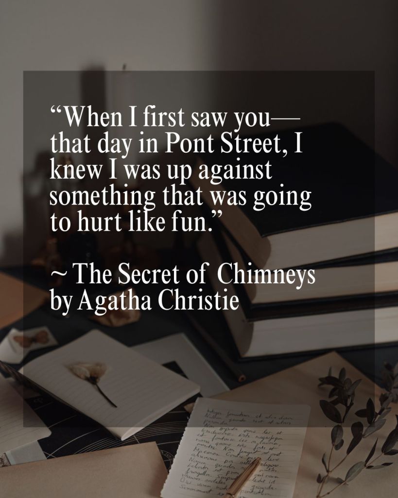 “When I first saw you—that day in Pont Street, I knew I was up against something that was going to hurt like fun.”  ~ The Secret of Chimneys by Agatha Christie