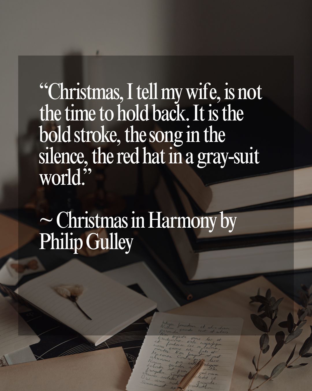 “Christmas, I tell my wife, is not the time to hold back. It is the bold stroke, the song in the silence the red hat in a gray-suit world.” ~ Christmas in Harmony by Philip Gulley