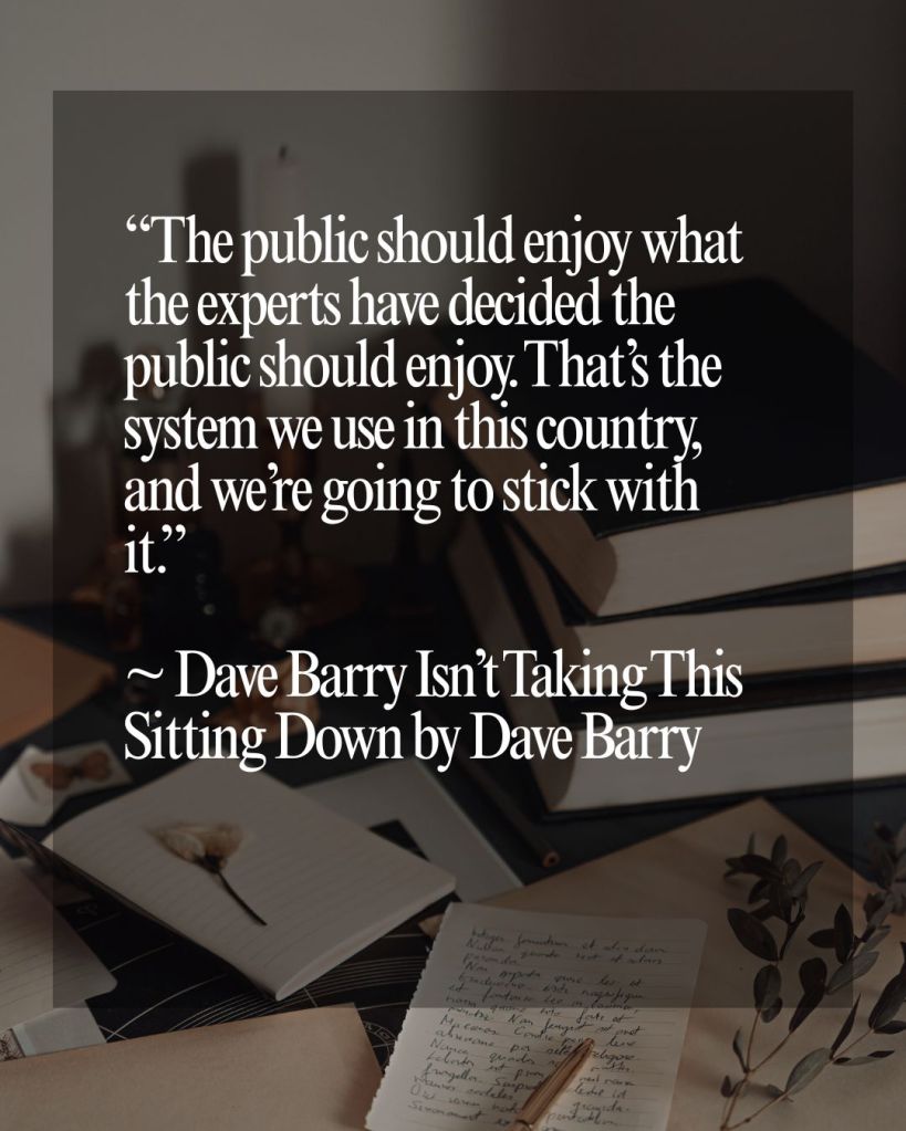 “The public should enjoy what the experts have decided the public should enjoy. That’s the system we use in this country, and we’re going to stick with it.”  ~ Dave Barry Isn’t Taking This Sitting Down by Dave Barry