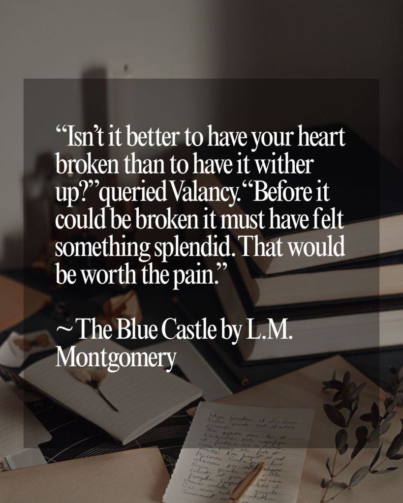 ‘”Isn’t it better to have your heart broken than to have it wither up?” queried Valancy. “Before it could be broken it must have felt something splendid. That would be worth the pain.”‘ ~ The Blue Castle by L.M. Montgomery