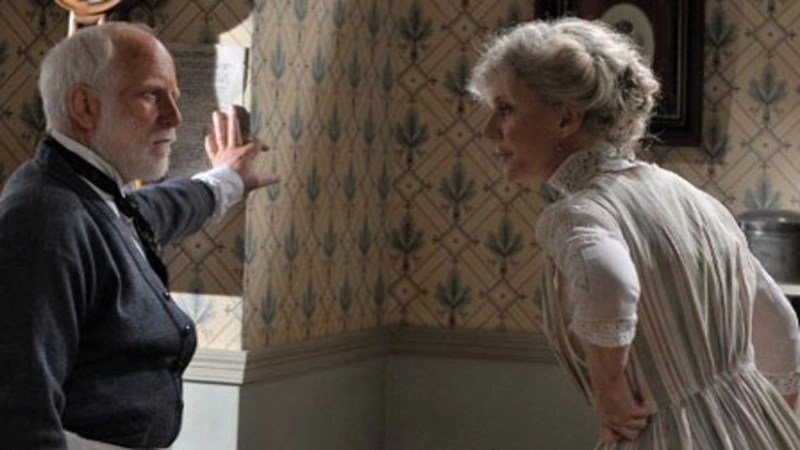 We then switch to Hugh Grant’s character, Reginald Anson (there is no way to say that name without using a British accent by the way. Try it. I dare you. It doesn’t sound right in an American accent) riding into a small village with another man, George Garrad, portrayed by Ian McNeice.