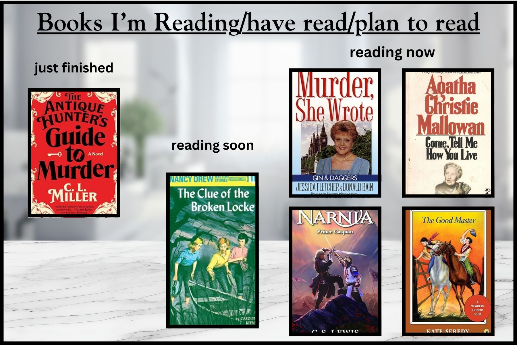 My slow read is still Come, Tell Me How You Live by Agatha Christie Mallowen, a non-fiction book by Agatha that is about her and her husband traveling to Syria for an archaeological dig. It’s good so far but a bit wordy and slow in some places so I’m not as interested to read it as I am my murder mysteries.