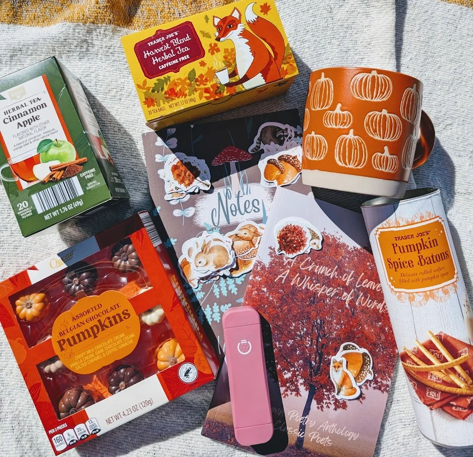 We also have a journal in there, stickers, an autumn-themed mug, chocolate pumpkins (so cute!), tea, a booklight to read your cozy books with, and I’ll also be adding a cozy blanket for you to curl up under and these cute little corner bookmarks for you to mark the page of whatever book you are reading.