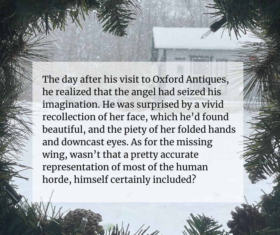 The day after his visit to Oxford Antiques, he realized that the angel had seized his imagination. He was surprised by a vivid recollection of her face, which he’d found beautiful, and the piety of her folded hands and downcast eyes. As for the missing wing, wasn’t that a pretty accurate representation of most of the human horde, himself certainly included?