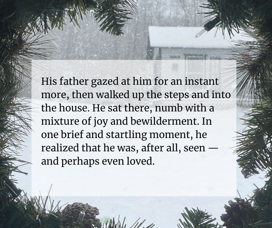 His father gazed at him for an instant more, then walked up the steps and into the house. He sat there, numb with a mixture of joy and bewilderment. In one brief and startling moment, he realized that he was, after all, seen — and perhaps even loved.
