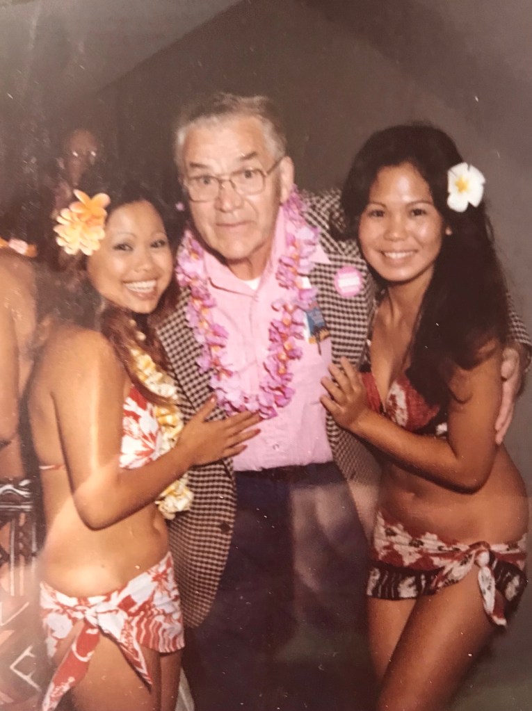 While looking through the photos, we found photos of my grandparents when they were young, my grandfather singing, my grandparents on their 55th wedding anniversary, my grandfather with his arm around some Hawaiian girls when he and Grandma visited Hawaii, and him with his cousin when they were young boys. The Boy looked at the photo of him hugging the Hawaiian girls with wide eyes but I explained that visitors are greeted when they arrive by young ladies and gentlemen with leis to hang over the necks of the visitors.