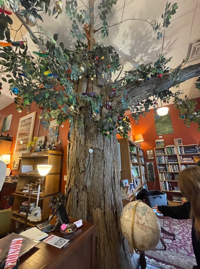 It is a cozy store with its walls covered with attractive bookshelves packed to the brim with books of all genres and varieties. There is a tree inside the store, people. A beautiful tree. Okay, the tree isn’t real (I mean..I don’t think? It really looked real.) There is also a record player up front behind the counter where the owner/staff member sets records on to play throughout the speaker system. Real records.