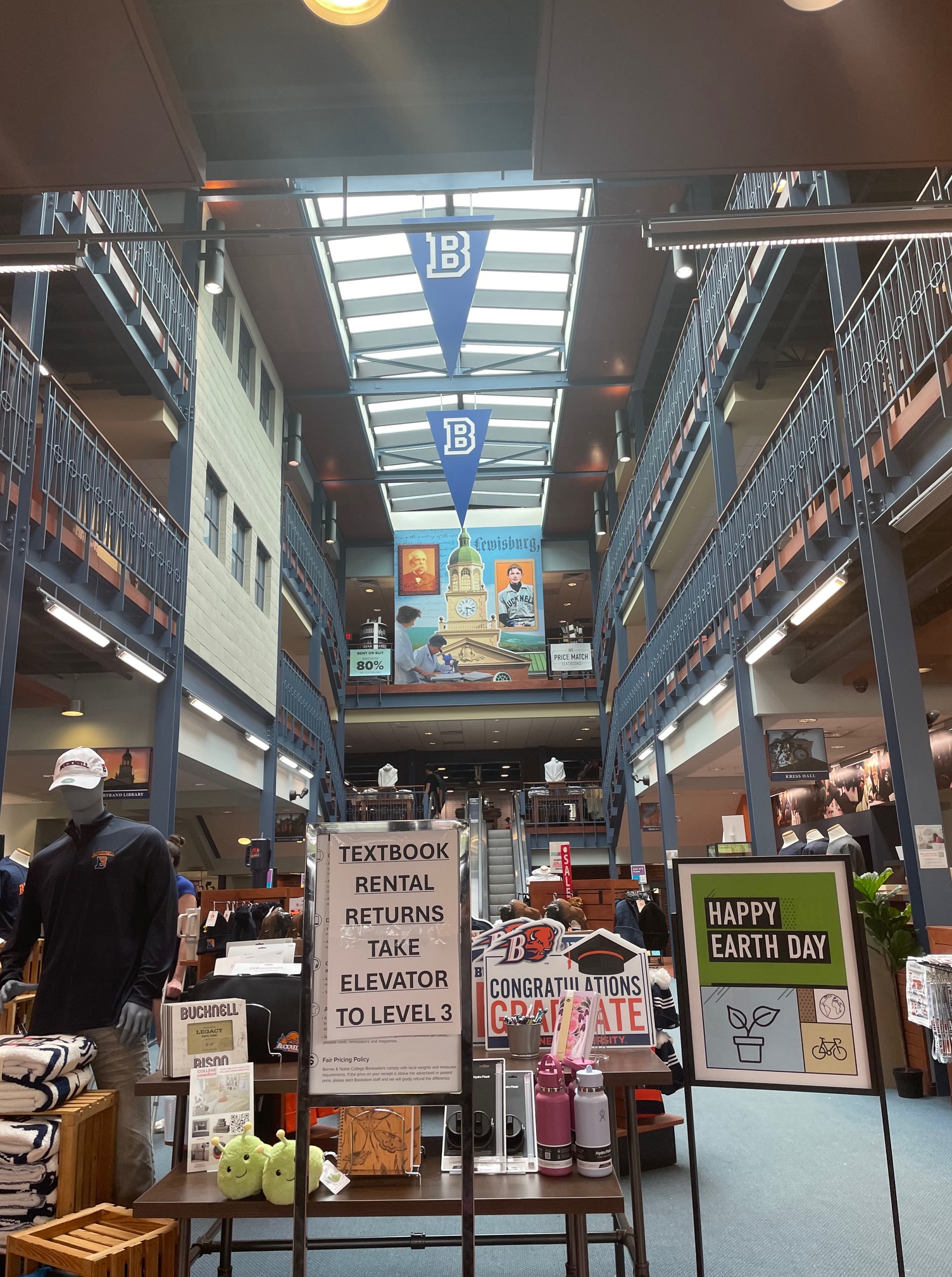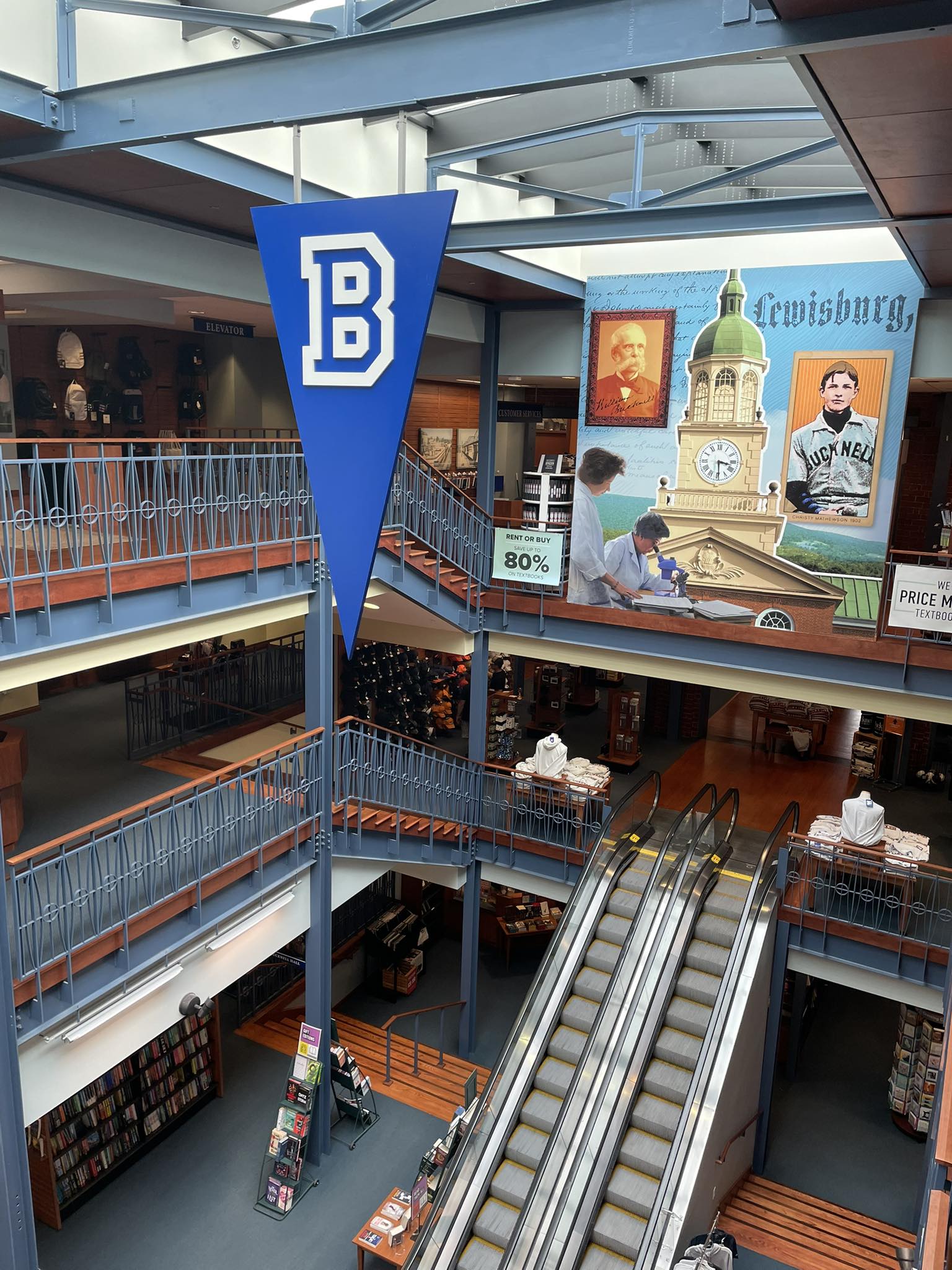 The first floor is the Barnes & Noble and a snack shop. An escalator leads to the second floor where merchandise and gear representing Bucknell University is held. The third floor is a campus bookstore where textbooks and other college supplies can be found.