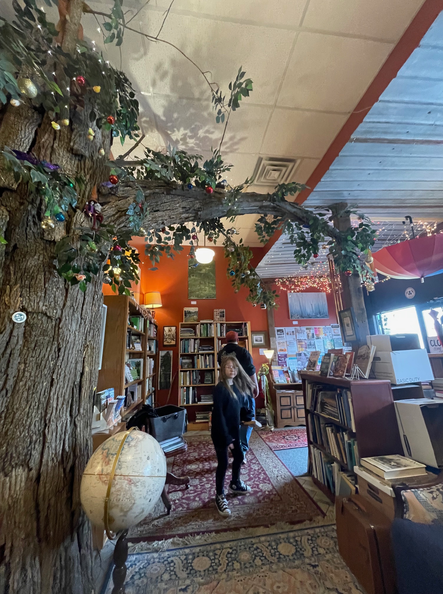 It is a cozy store with its walls covered with attractive bookshelves packed to the brim with books of all genres and varieties. There is a tree inside the store, people. A beautiful tree. Okay, the tree isn’t real (I mean..I don’t think? It really looked real.) There is also a record player up front behind the counter where the owner/staff member sets records on to play throughout the speaker system. Real records.