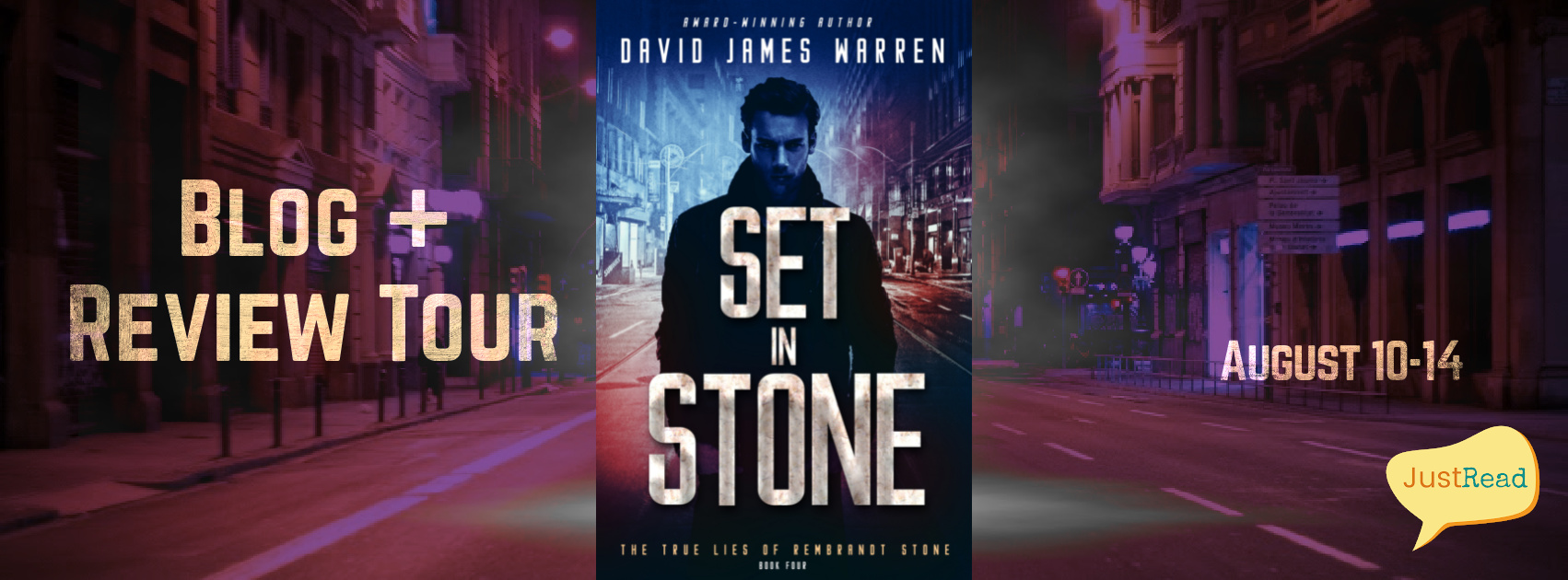 I’m on to the fourth book, Set in Stone, in the Rembrandt Stone series by David James Warren after finishing book three, Sticks and Stone, last week. Book four will release on August 10. I am reading it for a book tour being held the week of its release.
