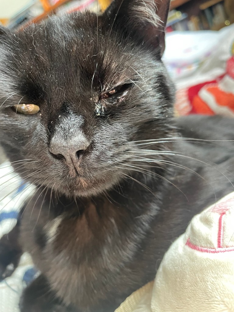 With spring weather comes skunk mating season, of course, and with skunk mating season comes more skunks in our yard which is probably why our youngest cat, Cass, was sprayed last Friday, as I mentioned in my post last week. We didn’t realize until a couple days later that the skunk probably got him in the eye and we only realized this when his right eye started gooping up with infection.