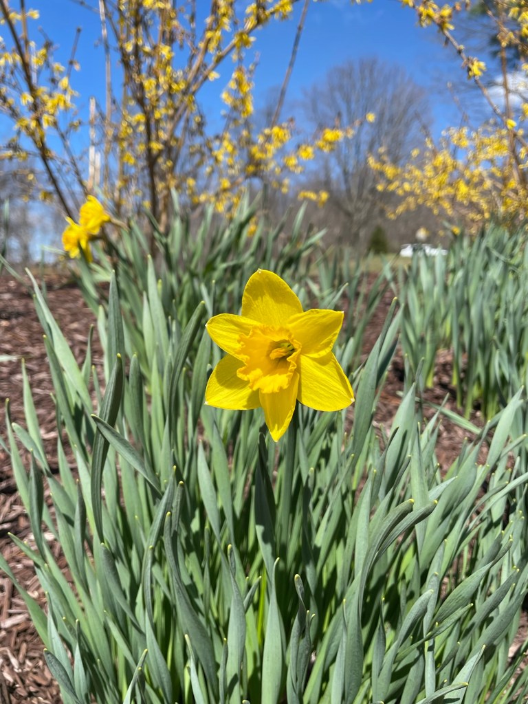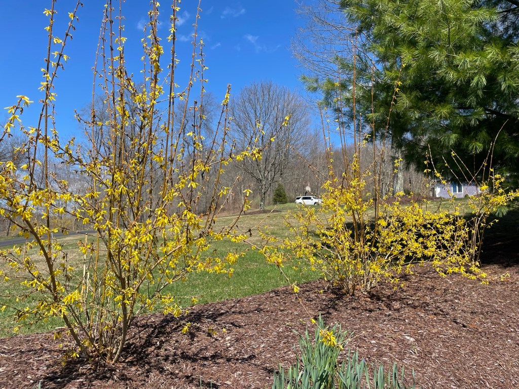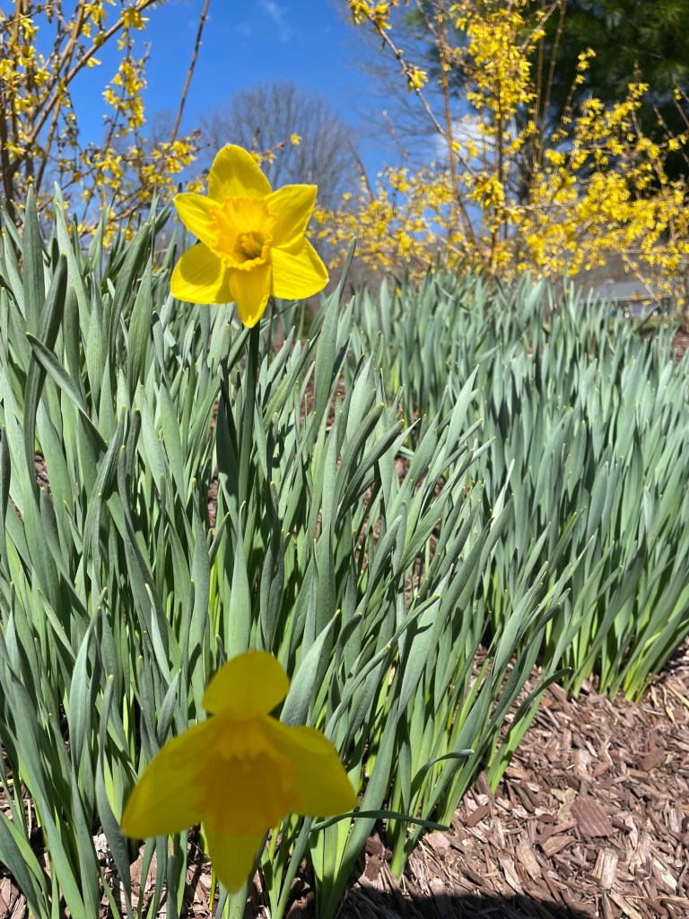 Today, however, we do have some sun, and it will be getting up into the 50s. In addition to the forsythia, there are daffodils growing up at my neighbors’ too.